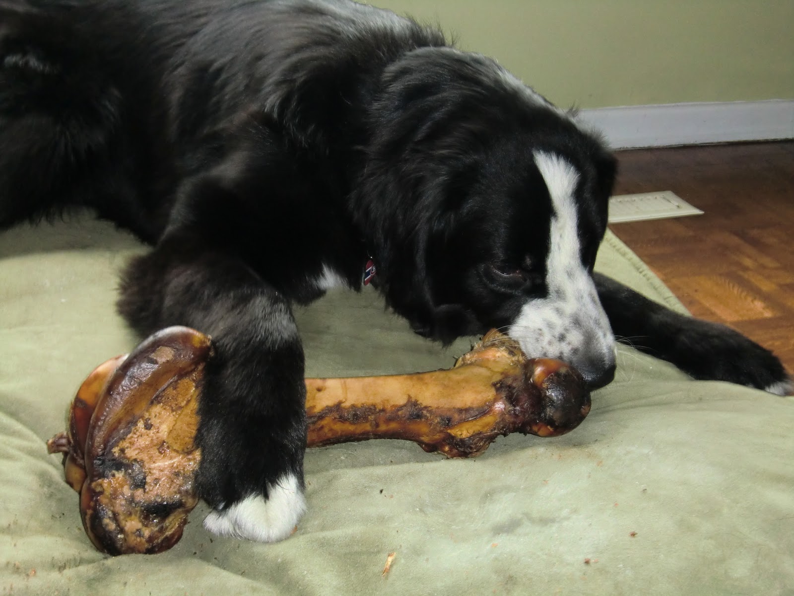 Encore Azur avec son gros os de mammouth! Attention quand même, il faut surveiller le chien et ça fait pas mal de gâchis en plus...